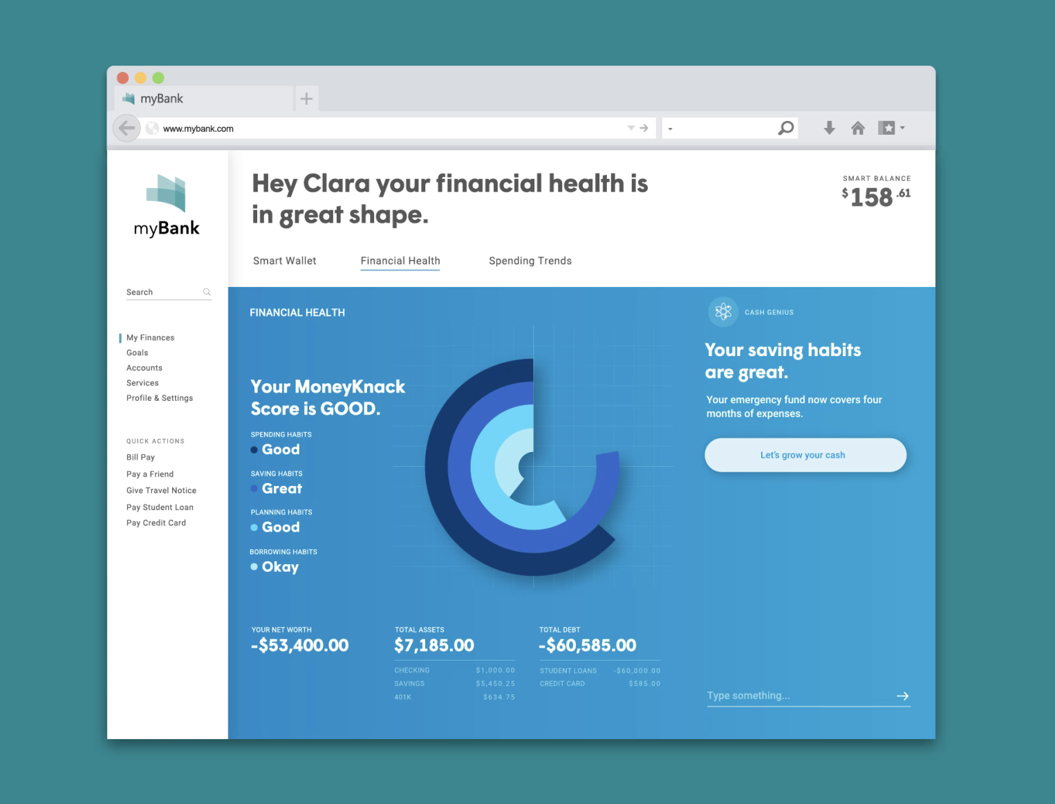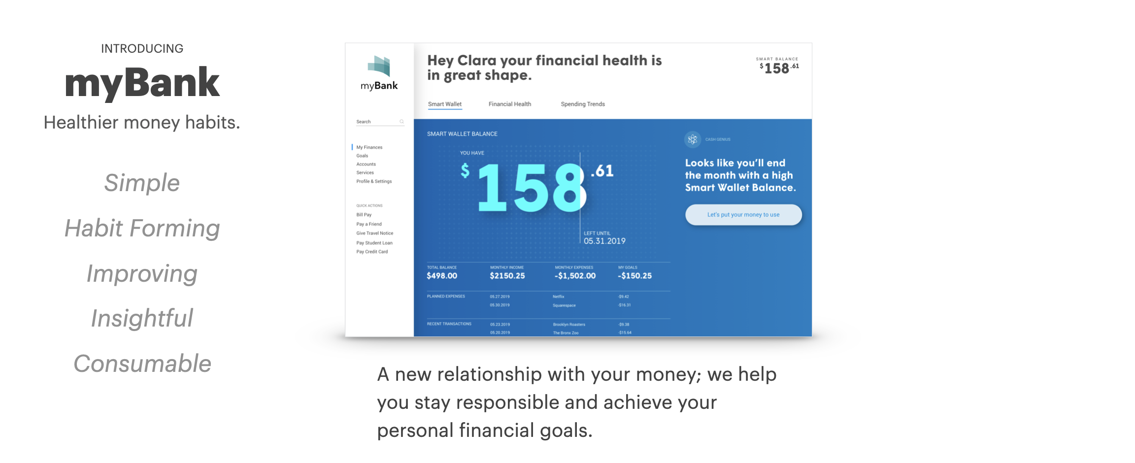 Based on trend research, FIS’s stated goals, and our own wishes for a banking platform to help us through our lives, we created a new concept that took a lot of the guesswork out of managing your money: